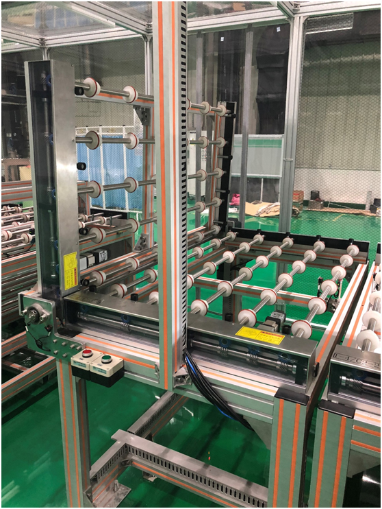 本装置为太阳能电池生产线中工艺设备与工艺设备连接时的基板传输装置。装置采用西门子1200控制系统和伺服电机作传输动力,精密不锈钢轴及POM传输轮+O型圈进行滚轮方式输送,并使用反射型光电传感器识别传输基板,与上游连接信号对接,起点传感器感应到基板电机传动,到达减速点减速,到达终点停止,未到达相应位置报警,与下游连接信号对接,基板完全脱离终点传感器电机停止转动,下游有故障,自动停止报警。该传输机采用变频电机翻转,空间结构合理,完全达到90°。