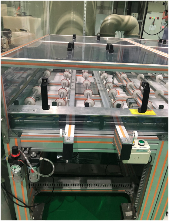 本装置为太阳能电池生产线中工艺设备与工艺设备连接时的基板传输装置。装置采用西门子1200控制系统和伺服电机作传输动力,精密不锈钢轴及POM传输轮+O型圈进行滚轮方式输送,并使用反射型光电传感器识别传输基板,与上游连接信号对接,起点传感器感应到基板电机传动,到达减速点减速,到达终点停止,未到达相应位置报警,与下游连接信号对接,基板完全脱离终点传感器电机停止转动,下游有故障,自动停止报警。该传输机具备人工单片进料、单片出料、连片进料、连片出料功能。六面密封减少车间粉尘对基板的污染。